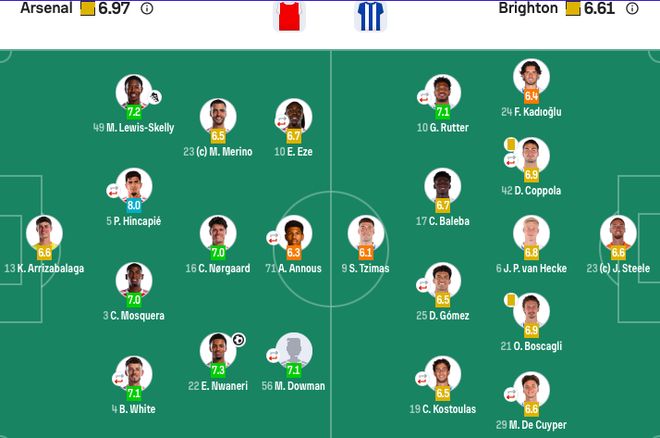 阿森納首發(fā):13-凱帕、4-本·懷特(70’12-廷伯)、3-莫斯克拉、5-因卡皮耶(70’6-加布里埃爾)、49-斯凱利、16-諾爾高、23-梅里諾、22-恩瓦內(nèi)里、56-道曼(70’7-薩卡)、10-埃澤(84’19-特羅薩德)、71-安努斯(77’41-賴斯)。