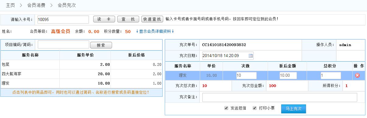 先會員刷卡定位到會員,然后輸入商品的名稱或簡碼或者掃描槍快速定位查找商品;或先會員刷卡,然后輸入充次項目編碼或簡碼查找服務(wù)項目;或者直接點擊服務(wù)項目;選擇服務(wù)項目后點擊結(jié)算此訂單如圖顯示: